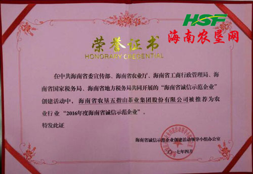 海南农垦网5月22日讯 近日,海垦茶业集团在中共海南省委宣传部、海南省农业厅、海南省工商行政管理局、海南省国家税务局、海南省地方税务局共同开展的“海南省诚信示范企业”创建活动中,被推荐为农业行业“2016年度海南省诚信示范企业”。(陆和)